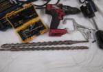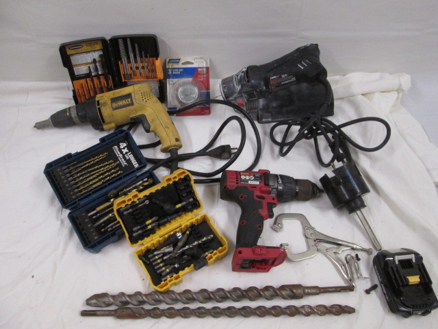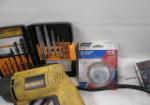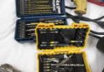 Lot of hand tools including a Rotozip Rotosaw, a corded Dewalt DW257 (cord has some issues), and a Hercules Hex Drill bit set and more. Please note that the battery shown in the lower righthand corner of the first picture was removed as it went with another item.