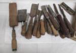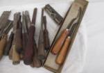 Collection of 20 vintage woodworking chisels for carving and carpentry.