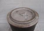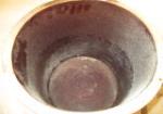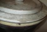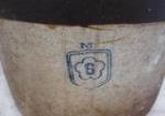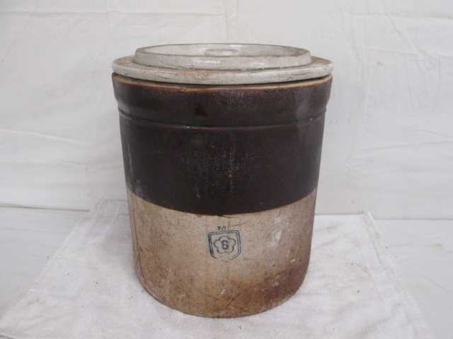 6 Quart Covered Crock in 2 Tone Color with Cobalt Blue Stamp. There is a chip in the lid but no cracks in the crock. Aged but in good shape. Please preview.