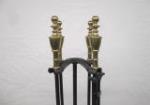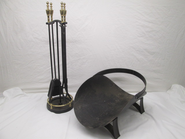 This lovely Pilgram brand fire place set features a log holder, broom, poker, log tongs and implement holder. This item is in used, good condition. Please preview.