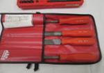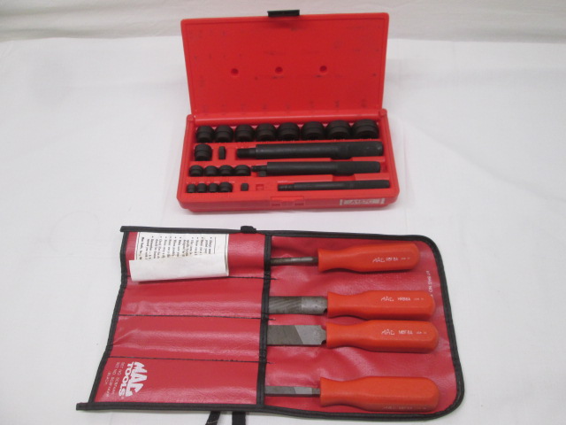 This selection of tools includes four "Mac" brand files in a red vinyl case and a "Snap-On" Bushing driver set in a convenient storage case. These tools are in used, good condition. Please preview.