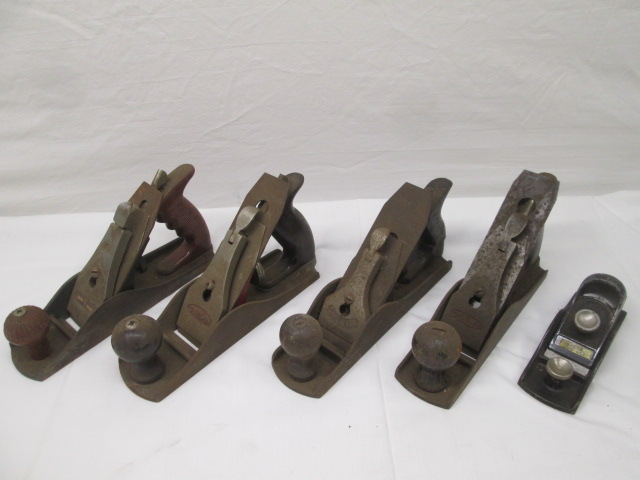 Assortment of five wood planes including the following brands: "Craftsman", Happy Home" and more.