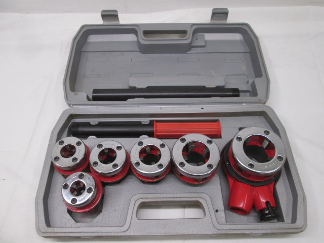 This unnamed exposed ratchet threader set, in its case, is in used, good condition. Please preview.