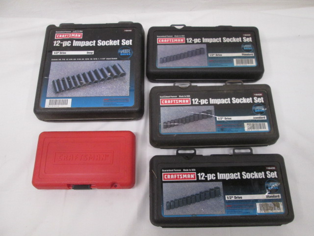 Nice selection of Craftsman brand tools including three sets of Craftsman 12-pc 1/2" drive standard impact socket sets (model # 19430), Craftsman bolt-out damaged bolt/nut remover set, and a Craftsman 12-pc 1/2" drive deep impact socket set .