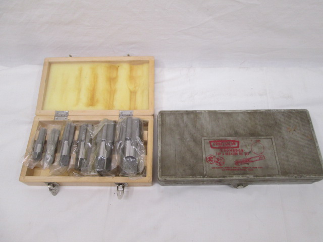 Set of six unnamed threading taps ranging in size from 1/4 - 1/8 to 1-1/4 - 11-1/2. These taps are held in a nice wooden box. Also included is a Craftsman Kromedge tap and hexagon die set.