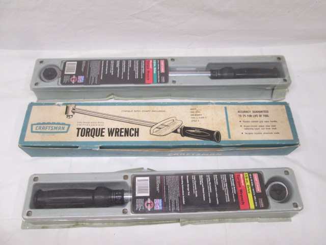 This trio of Craftsman torque wrenches includes an older dual range scale that reads 0-150 ft./lb & 0-20.74 M/kg. torque wrench and two Microtork torque wrenches (3/8" drive and a 1/2" drive). These wrenches are in their original packages and are in used, good condition. Please preview.