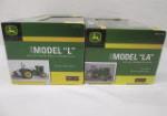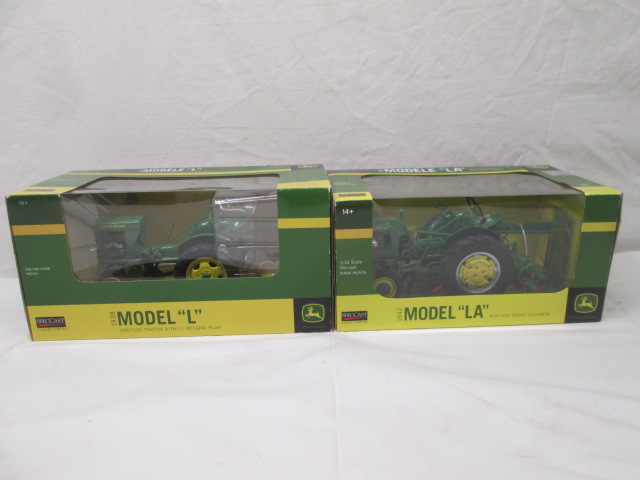 Pair of new SPECCAST collectible John Deere 1/16 die cast metal replicas. This pair includes the 1942 model "LA" with leaf spring cultivator and the 1938 Model "L" unstyled tractor with L-1 integral plow.