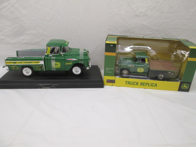 Pair of collectible John Deere Series 1/25 die cast metal replicas. This pair includes a John Deere 1957 Chevy pickup truck and a Speccast collectible 1/25 scale die-cast metal replica of a John Deere truck.