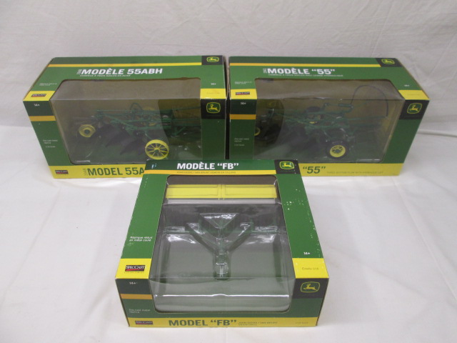 This trio of new Speccast collectible John Deere Series 1/16 die cast metal replicas include a 1941 Model "55" three bottom plow with hydraulic lift, a 1948 Model 55 ABH Three Bottom Plow on Steel and a "FB"Grain Drill. These items are in new condition. Please preview.