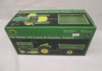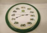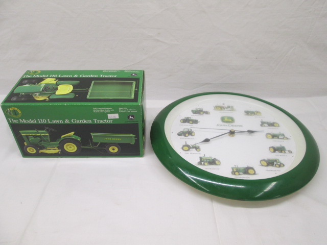 Pair of John Deere collectible items including a John Deere battery operated clock featuring John Deere tractors and an ERTL John Deere 1:16 scale die cast metal replica of the Model 110 Lawn & Garden Tractor.