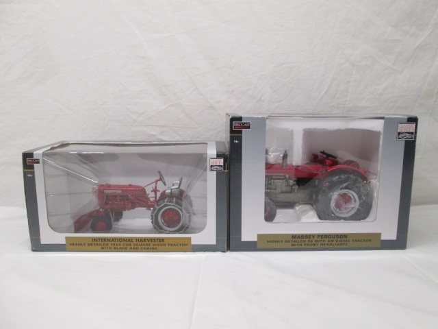This pair of new SPECCAST collectible Classic Series 1/16 die cast metal replicas include an International Harvester, Highly Detailed 1964 Cub Square Hood Tractor with Blade and Chains and a Massey Ferguson Highly Detailed 98 With GM Diesel Tractor with Front Headlights. These items are in new condition. Please preview.