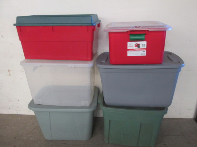 Assortment of six large plastic storage bins with lids.This assortment includes a Homz 4 gallon bin, a Rubbermaid 18 gallon bin, two unnamed 18 gallon bins and two 20 gallon bins.