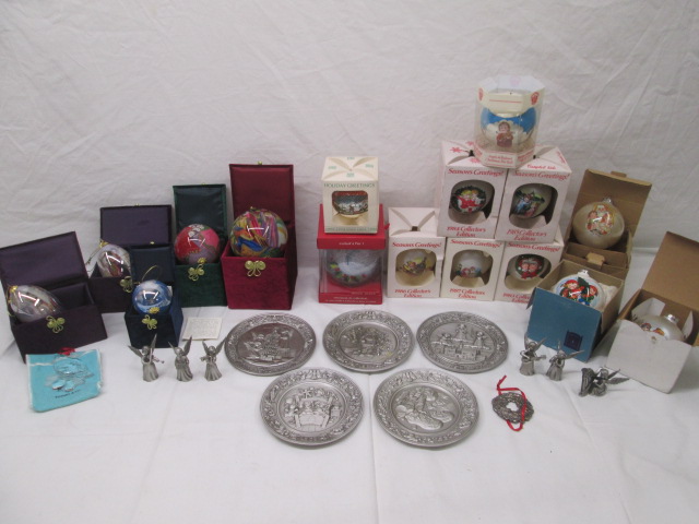 Stunning collection of Christmas items, including a Tiffany & Co. crystal ornament, five Li Bien ornaments featuring the age old skill of inside painting. These beautiful ornaments feature doves, and angels. Also included in this lot our eight Campbell’s Kids ornaments, six 2-1/2” Hudson, pewter Angel figures, five 6” "Night Before Christmas" pewter plates and more.
