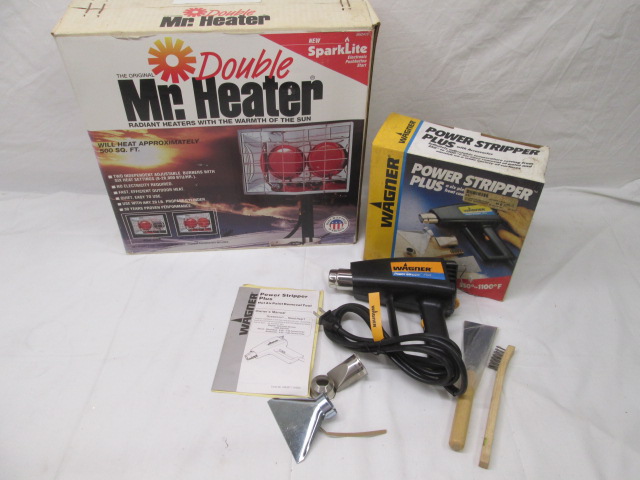 Stay warm with this Sparklite brand "Mr. Heater" utility heater. This item provides radiant heat for up to 500 square feet. Also included is a Wagner Power Stripper Plus with accessories. These items are in their original (opened) boxes and are in used, mint condition. Please preview.
