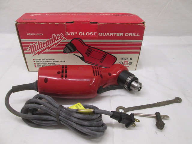 This Milwaukee brand heavy duty 3/8' close quarter drill (model # 0375-6) is in its original box and is in used, good condition. Please preview.