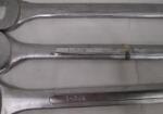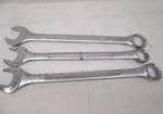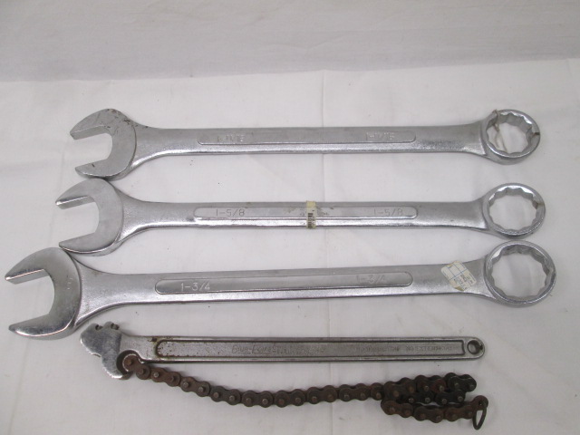 This assortment of four wrenches includes three large combination wrenches (sizes 1-3/4", 1-5/8", 1-11/16") and a Blue Point pipe chain oil wrench. These tools are in used, good condition. Please preview.
