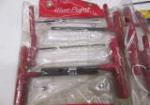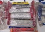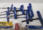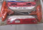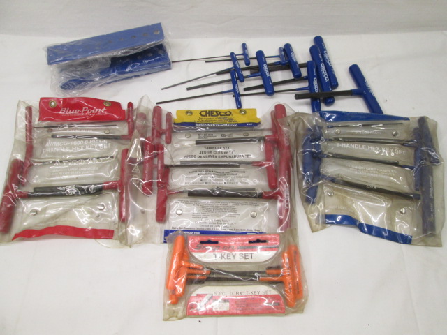 This large assortment of T-handle Key sets includes a Snap-On brand 5 piece Torx T-Key set, an eight piece Blue Point 6" long reach hex key set (sizes 2mm -10mm and missing 2 pieces), an eight piece Blue Point T-handle hex key set (size 3/32"-1/4"), an eight piece Chesco T-Handle set (2mm-10mm) and an additional set of Chesco T-Handle hex keys with a stand (sizes 3/32"-1/4"). These items are in used, good conditionin their original opened packaging. Please preview.