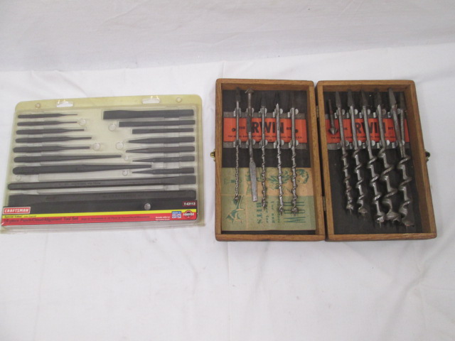 Craftsman 16 piece Punch/Chisel/Alignment Tool Set (model # 943113) and a vintage Irwin auger bit set in its original box.