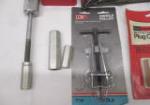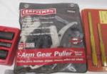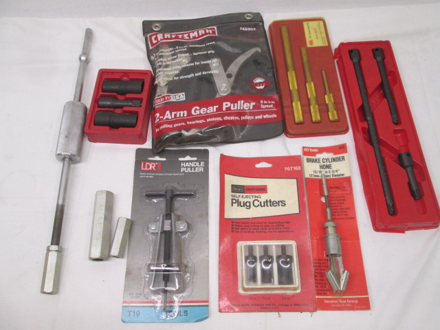 Collection of miscellaneous tools including a (new) LDR handle puller, a (new) K-D Tools brake cylinder hone, a (new) package of Craftsman Plug Cutters, a Craftsman 2-arm Gear Puller, and more.