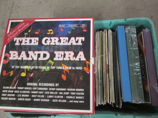Large bin of vinyl albums and album sets featuring a variety of artists and genres. These artists include "The Great Band Era", Lawrence Welk, Carol King, Carly Simon and more.