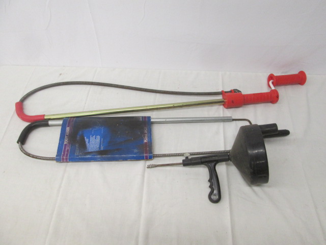 This Trio of plumbing tools includes a Ridgid brand K-3 toilet auger, a (new) Plumb Shop brand toilet auger and a Cobra brand plastic, drum toilet auger. These items are in new and used, good condition. Please preview.