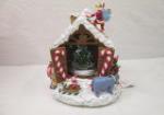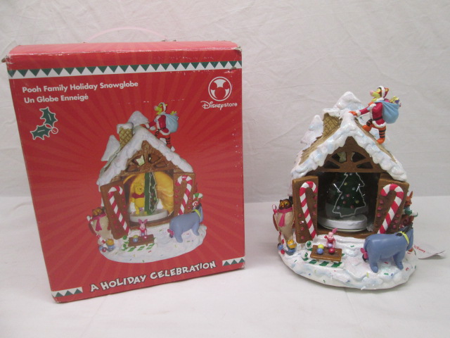 This "Disney Store" Pooh Family Holiday 9-1/2" wind-up musical snowglobe is in its original box. It is in used, good condition, however Piglet is missing one ear. Please preview.