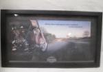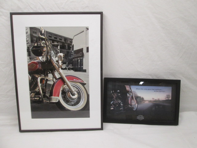This pair of motorcycle related photos includes a 15" X 20" framed photo by JP McMaulton of a motorcycle and a 14" X 8-1/2" Harley Davidson brand motorcycle photo with a quote stating "When the Only Goal That Matters Is The Horizon." These items are in used, good condition. Please preview.