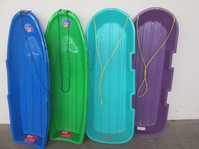 Get ready for the snow with these four kids winter plastic toboggans. Two are Flexible Flyers, two are unknown brand. In used, good condition. Measures approximately 47" x 17".