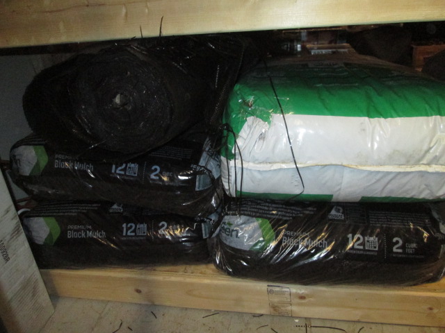 Lot of landscaping supplies including 3 bags of Sta-green premium black bark mulch, 1 bag of premium peat moss, and a 40" wide roll of porous weed barrier.