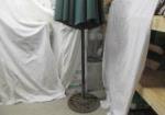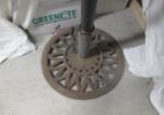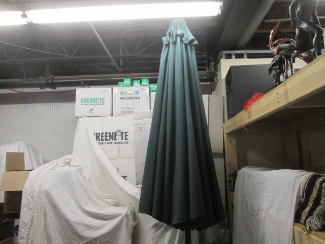 Tempera patio umbrella with cast iron stand measuring 98" tall. Stand base measures 18" across.