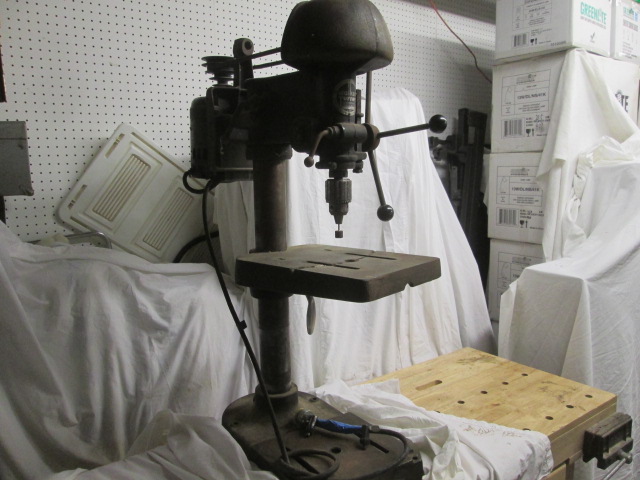 Vintage Walker Turner tabletop drill press measuring 41" tall x 11" wide x 26 1/2" deep. Powers up. Please preview.