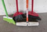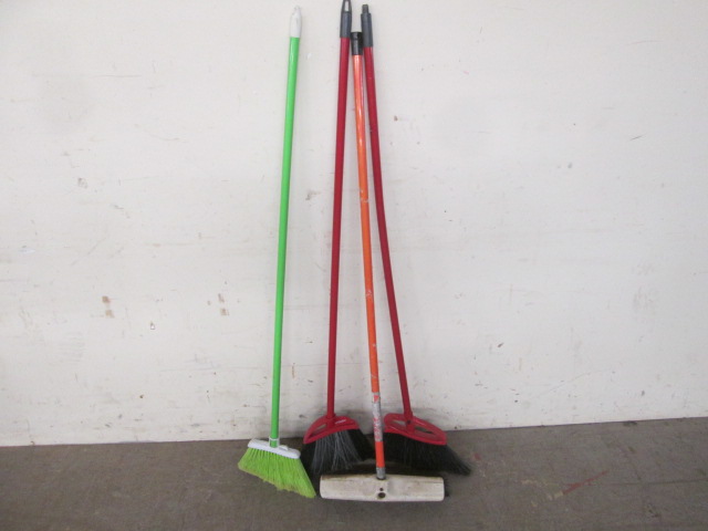 Lot of four brooms including a push broom and three angle brooms. Please preview.