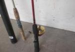 Lot of three fishing poles including a Johnson Citation, a Quantum Vantage graphite pole, and a Kastking Crius with a Flambeau plastic case.
