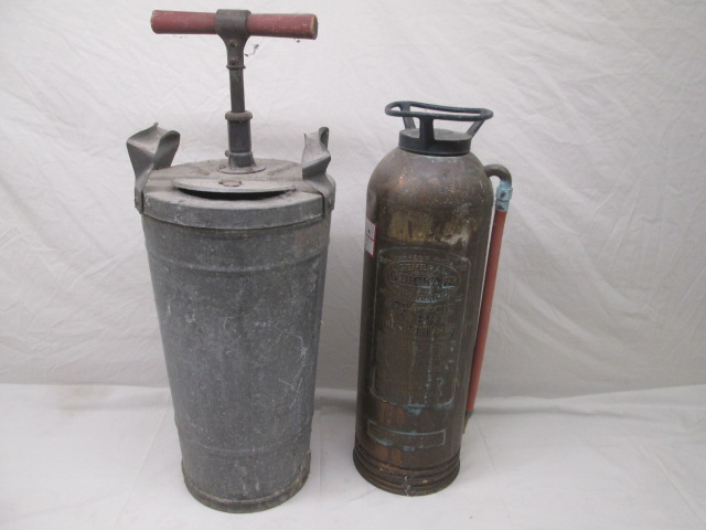 Two vintage fire extinguishers. One is a hand pump fire extinguisher, and the other is a Quick-Aid TS-15 Soda-acid fire extinguisher.