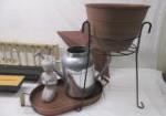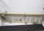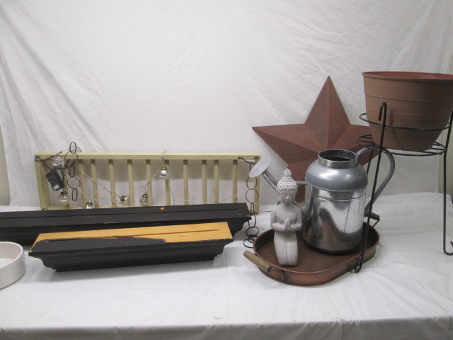 Lot of home decor items including a lighted, 3' long hanging pot rack, two wooden shelves (3' and 2'), a 12.5" kneeling Buddha concrete figure and more. Please preview.