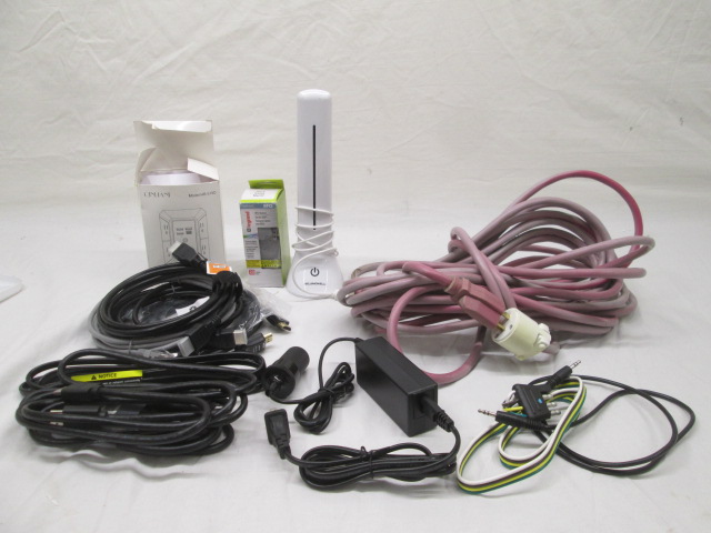 Power cord bin including an outdoor extension cord, a Qinliane model HR-519D 5 AC outlet with 3 USB and 1 USB-C, a Bell Howell lamp, HDMI cords and more. Please preview.