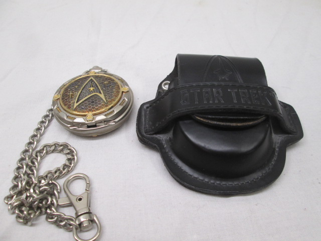 Franklin Mint Star Trek pocket watch with black leather pouch.