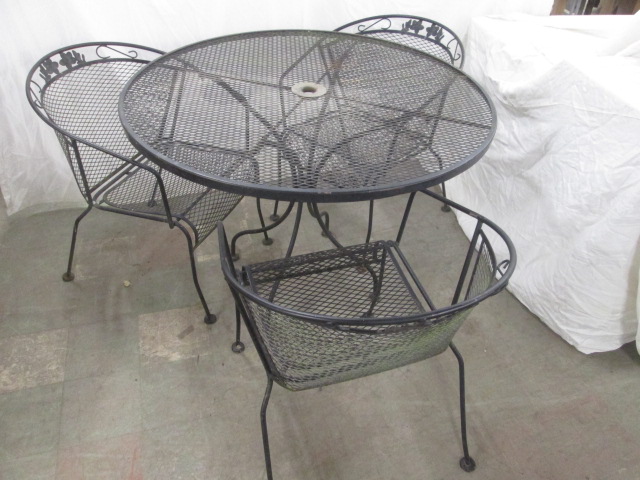Beautiful Vintage Woodard style wrought iron patio set including a circular table and three Barrel Chairs.