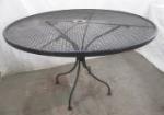 This beautiful vintage Woodard style wrought iron patio set includes a circular table and three barrel chairs. The chairs feature a lovely leaf design on the chairs and a spot for an umbrella. The table measures 42"W X 30"H. This set is in used, good condition. Please preview.