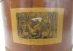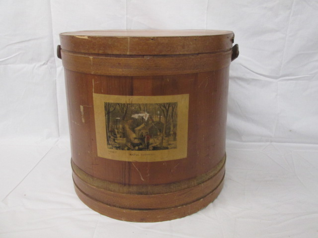 This vintage 15" firkin is a type of small wooden bucket or barrel. Firkins were historically used for storing dry goods such as sugar, flour, or butter. This item has a Currier and Ives image featuring a maple sugar tapping image on the front. This item is in used, good condition. Please preview.