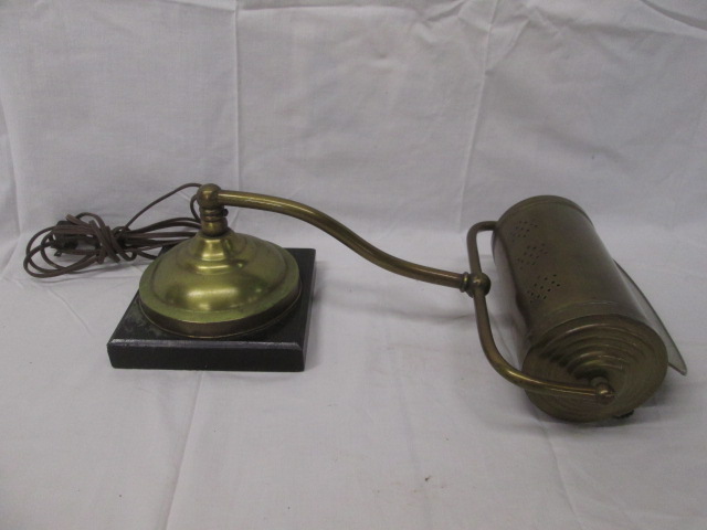 This lovely antique brass piano lamp with a black stone base is in good, used condition. Please preview.