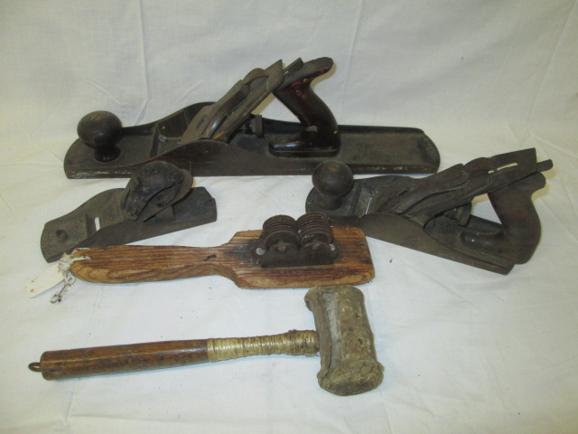 This selection of five vintage tools includes three wood plains, a wooden mallet, and a home-made knife sharpener. These items are in used, good condition. Please preview.