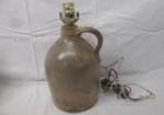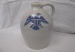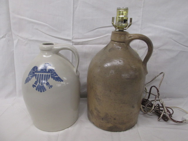 Pair of colonial style jugs including a 10" Pfaltzgraff colonial style jug with a blue eagle on the front and one 14-1/2" jug that has been converted into a table lamp.