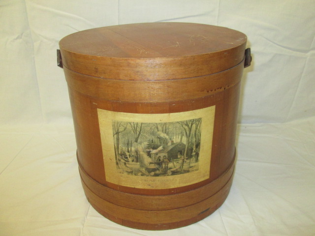 Vintage 11" Firkin (smaller of the 2) is a type of small wooden bucket or barrel. Firkins were historically used for storing dry goods such as sugar, flour, or butter. This item has a Currier and Ives image featuring a maple sugar tapping on the front.