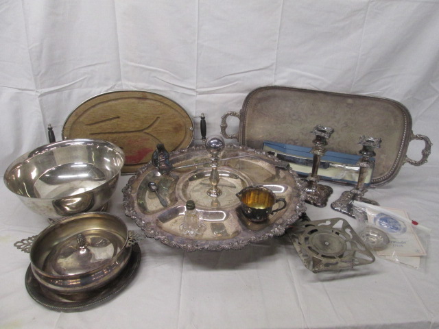 Large assortment of sixteen pieces of silver plate including a large ornate 19-1/2" Lazy Susan, a large bowl, a large ladle, a beautiful pair of 9" candle sticks and more.
