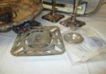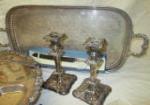This large assortment of sixteen pieces of silver plate includes a large ornate 19-1/2" Lazy Susan, a large bowl, a large ladle, a beautiful pair of 9" candle sticks and more. These pieces are in used, good condition. Please preview.
