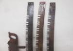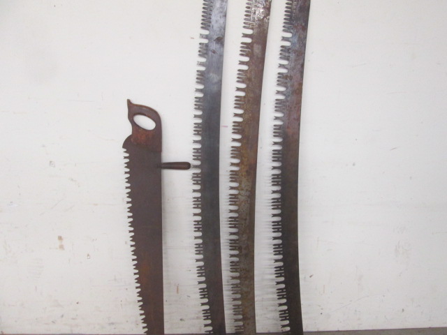 This assortment of four vintage saws includes blades from three, two-person symmetrical saws also known as "misery whips" and a crosscut saw. The "misery whips" do not have the handles. These items are in used, good condition. Please preview.