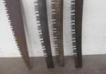 Assortment of four vintage saws including blades from three, two-person symmetrical saws also known as "misery whips" and a crosscut saw.