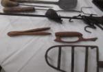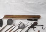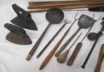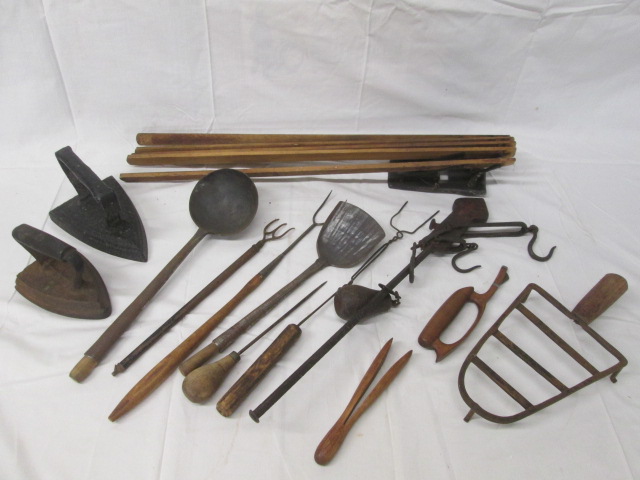 Wonderful collection of antique household tools including a wooden wall clothes drying rack, two cast iron "sad" irons, an iron trivet with a wooden handle, a steelyard balance scale and more.
