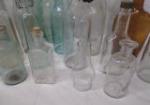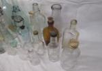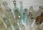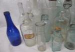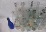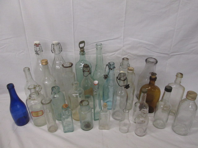 Large assortment of 25+ vintage bottles including an amber bottle with a coin/cork stopper, a cobalt blue bottle, several "swing top" bottles, a vintage Moxie bottle with a Moxie stopper, medicine bottles and more.